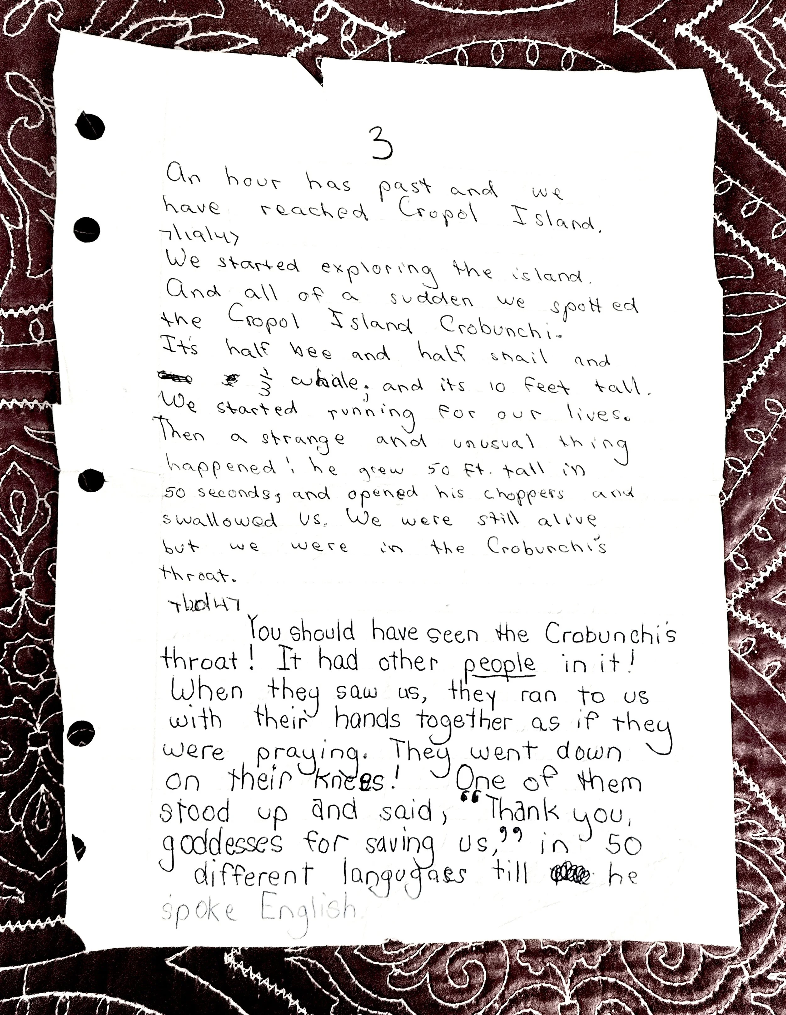 But there we were on the floor of Leah’s bedroom taking turns writing entries for our journey to Cropol Island. It was the story of our mission to find a cure for Dora’s Deadly Disease. Our task was to search for the Zorple Zemaya and Loople Trygania leaves to extract a healing substance called Gloopoxia Montrezoid in the deep dark-dense-dim-dusky swamps of Cropol Island.